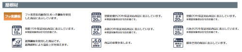 横暖ルーフの品質保証につきましては製品の種類により塗膜15年塗膜変色20年赤錆20年穴あき25年などがあります。