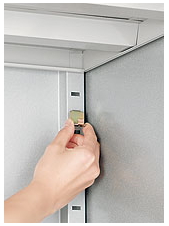| イナバ物置のアイビーストッカーの扉には半開き防止のラッチ機能と、安心のシリンダー錠付き。鍵はリバーシブルキーを採用しました。また内側からも扉を開けることができるよう、操作部に蛍光シールが付いています。 |